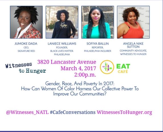 On Saturday, March 4, 2017, Witnesses to Hunger launched a new community forum series, “Cafe Conversations” at The EAT Cafe in West Philadelphia. The goal of these forums is to engage the community in conversations about poverty, brainstorm practical actions and solutions, and network with other individuals and organizations whose goals include ending hunger and poverty.